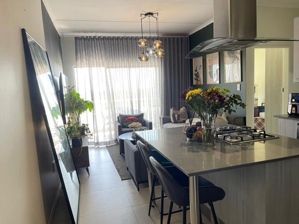 Step inside to an expansive open-plan living area, bathed in abundant natural light streaming through large sliding glass doors that lead to a private balcony. The interior boasts a refined aesthetic, featuring contemporary light fixtures, elegant tiled flooring, and a seamless flow designed for both grand entertaining and intimate relaxation. The gourmet kitchen is a masterpiece of design and functionality, showcasing light wood-grain and light grey cabinetry, sleek stainless steel appliances, and a central island complete with an integrated gas hob and sophisticated breakfast bar seating. Ample storage and an integrated washing machine underscore the thoughtful design.