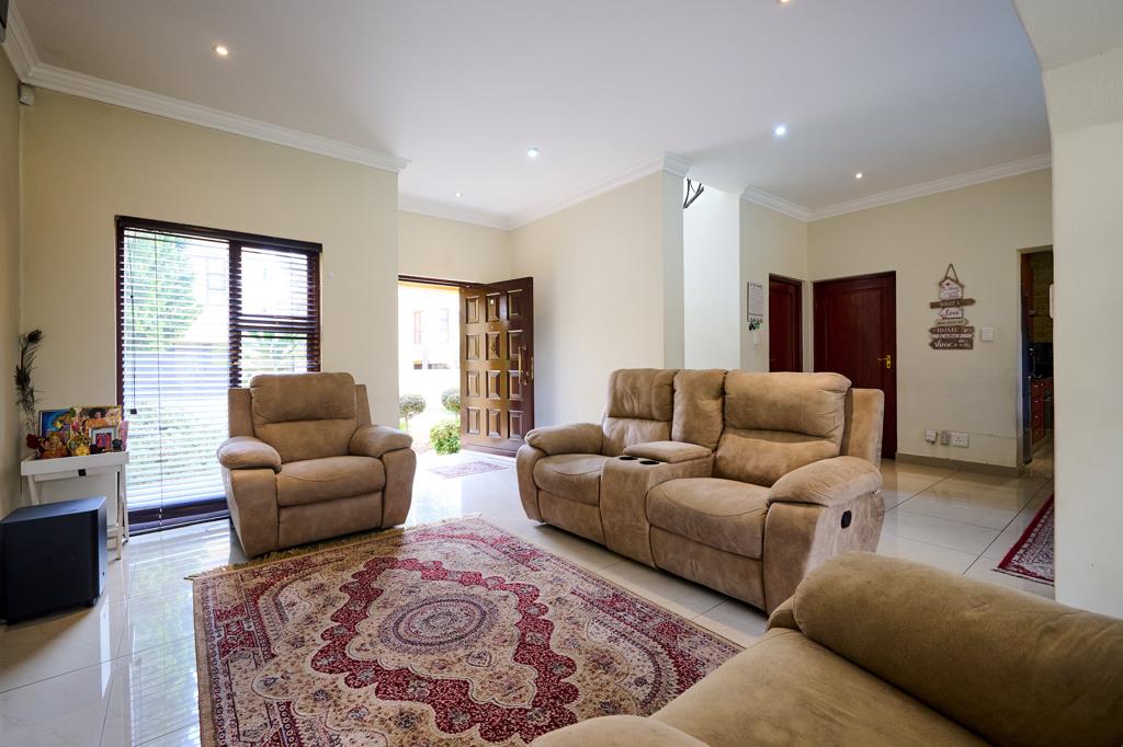 A downstairs guest bathroom with toilet and basin is conveniently located near the living areas. Outside, the home offers a beautifully manicured garden, a paved entertainment area with a built-in braai, and a sparkling swimming pool, perfect for relaxed gatherings and sunny weekends.