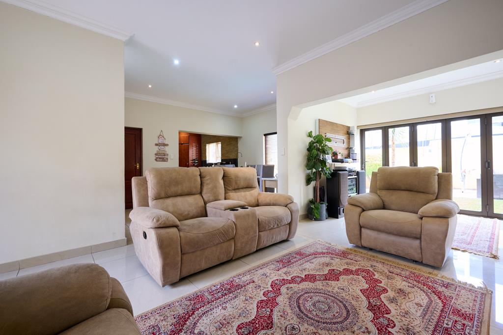 Stepping inside, you enter a tiled lounge fitted with air conditioning, offering a cool and comfortable living space. Behind the lounge is a versatile enclosed living area with stacker doors that open out into the garden, creating superb indooroutdoor flow. The dining room adjoins the well-appointed kitchen, which features a prep bowl, space for a double-door fridge, ample cupboard storage, a pantry, and a dedicated scullery area with space for three appliances.