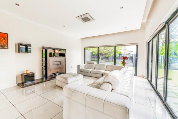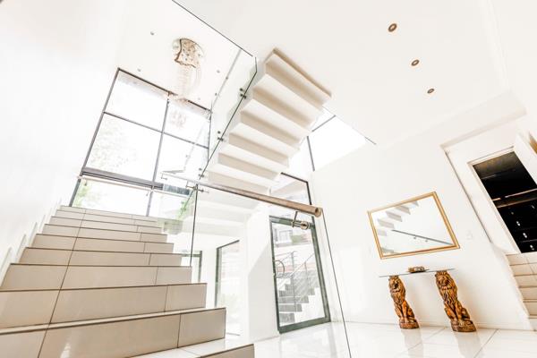 Experience the pinnacle of luxury living in this stunning north-facing, four-bedroom residence, uniquely situated on a prominent corner stand within the prestigious Helderfontein Estate. This elevated home epitomizes modern architecture with its sleek lines, towering ceilings, and expansive windows that bathe the interiors in natural light, creating an inviting and sophisticated ambiance.