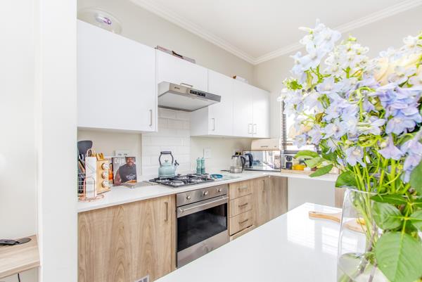 The sunny open-plan living area features a built-in server and wine rack, flowing seamlessly onto a private balcony with a built-in braaiideal for entertaining.