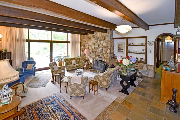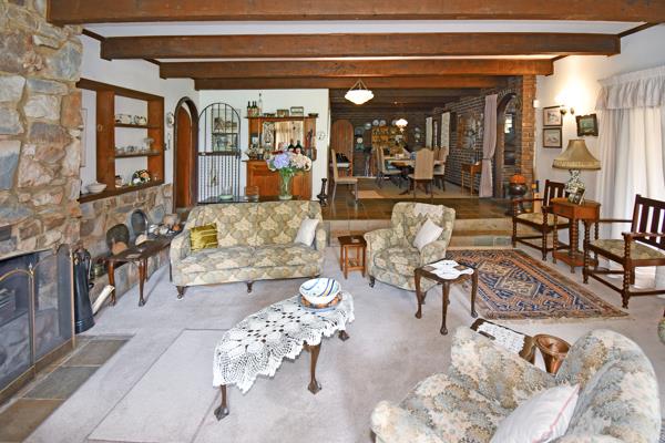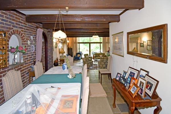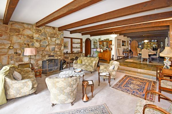 The home is peacefully positioned along a dirt road and is approached via a brick-paved driveway with mature trees. Upon entering, you are welcomed into an entrance hall that opens into a spacious open-plan lounge with a fireplace, covered patio and dining area. Just off the lounge is a self-contained TV lounge and bedroom with its own bathroom, ideal for use as a guest suite or for an extended family.
