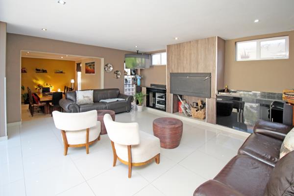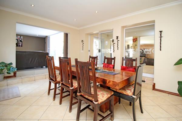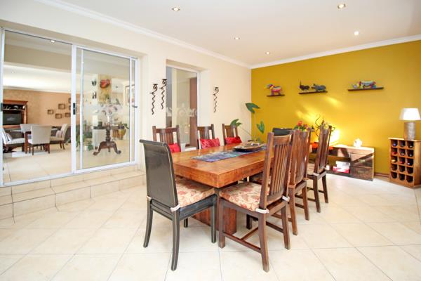 Formal dining room and enclosed patio with built in braai and stacker doors opening to garden and pool - perfect for year round entertaining!