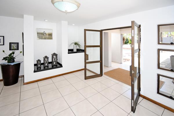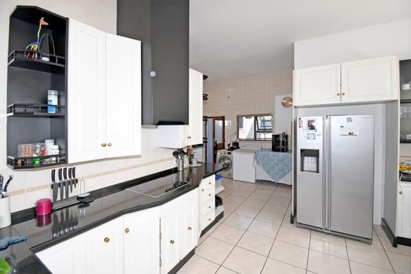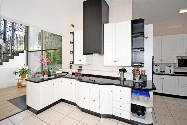 Formal lounge, TV lounge, family room, dining room, bar and kitchen all open out to the big covered patio and outside entertainment space. Step into a serene oasis where indoor and outdoor living blends seamlessly. This stunning home features a spacious patio that extends over a vibrant, manicured garden, offering breathtaking views of lush greenery and rolling lawns. Perfect for entertaining or quiet relaxation, the patio is designed for ultimate comfort, with ample seating, built-in braai, ambient lighting, and a gentle breeze that carries the scent of blooming flowers. Separate outside entertainment area is located in the garden. The kitchen is a chefs dream with oodles of cupboard space, gas and electric hob, space for a double door fridge, eat in kitchen space, scullery and a laundry space.