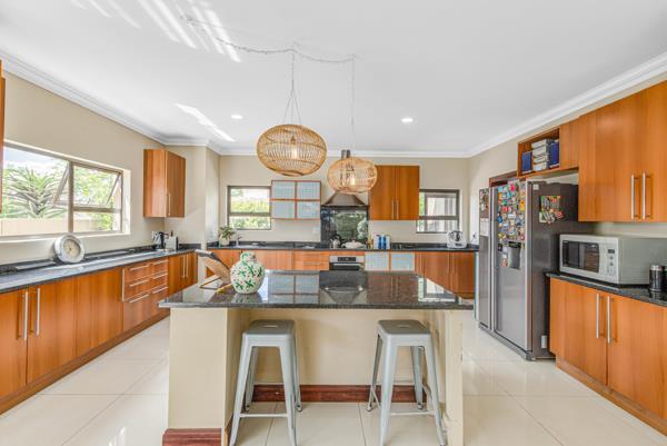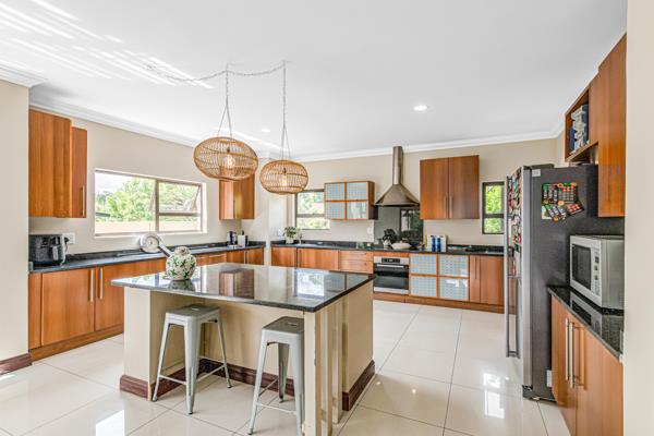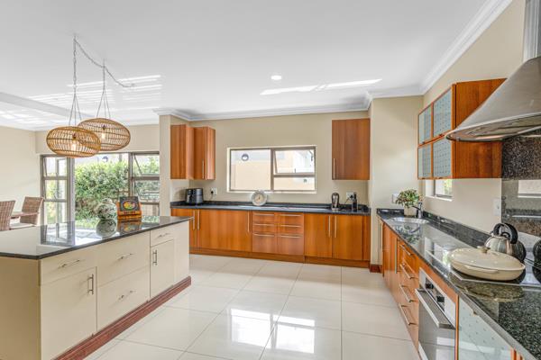 Step into this exquisite residence, where abundant natural light creates an illusion of spaciousness and enhances the overall quality of the home. Upon entry, you will be welcomed by a striking staircase adorned with a stainless steel balustrade. The open-plan TV lounge is thoughtfully situated and features a cozy log-burning fireplace, perfect for warmth on chilly winter evenings. Adjacent to this lounge is a well-placed bar area with granite countertops and a basin, along with an enclosed wine cellar. A remarkable highlight of this property is the stunning upstairs library, which offers a breathtaking view of the open-plan lounge below. Additionally, there is a separate TV room or cinema that opens to a private garden, which could also serve as an excellent office or children''s playroom. The open-plan dining area provides seamless access to a beautifully covered patio, showcasing impressive views of the garden and pool. At the heart of the home lies the well-equipped kitchen, featuring a spacious galley island that invites gatherings and the creation of cherished memories with family and friends. A separate pantry and scullery offer ample storage for all appliances. The residence includes six generously sized bedrooms (three on the ground floor and three upstairs), with two en-suite bathrooms and a total of 4.5 bathrooms.
