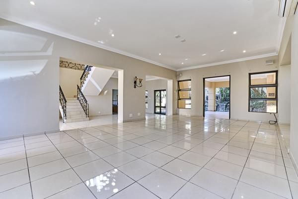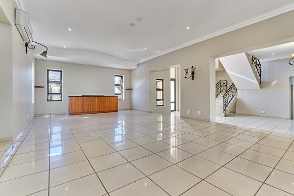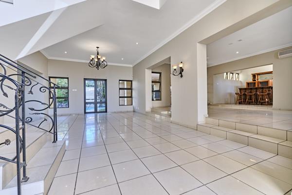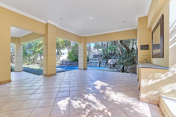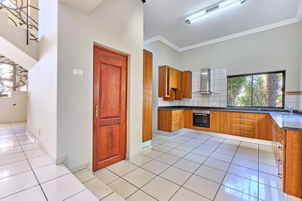 Designed with family living in mind, the home features generous open-plan living areas enhanced by double-volume ceilings and doors that frame views of the sparkling pool and landscaped garden. The kitchen is a true heart of the homewell-appointed with granite countertops, a large separate scullery, and direct access to three garages for added convenience.