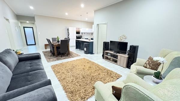 The heart of the home is a sleek, fully equipped modern kitchen with ample cupboard space, flowing effortlessly into the open-plan dining and lounge area.