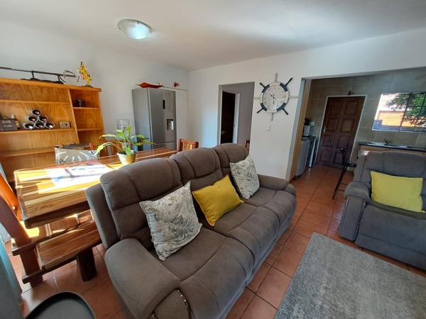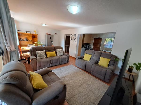 This warm and welcoming home features a spacious open-plan layout, combining the kitchen, dining, and living areas for seamless everyday living and entertaining. The kitchen is equipped with granite countertops, an electric hob and oven, space for a fridge and two undercounter appliances. The living room opens out onto a covered patio with a built-in braai and a garden with swimming pool, ideal for family get together and entertaining.