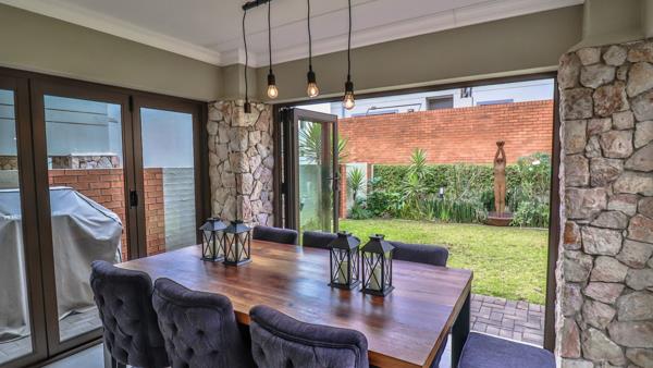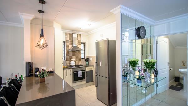 Entrance into this home leads into the open-plan kitchen and lounge. The kitchen has Caesarstone counter tops with ample cupboard space, a gas hob with electric oven and a breakfast counter. The scullery has space for 3 under-counter appliances and leads out to the courtyard. The spacious lounge leads onto an enclosed patio with stacking doors, ideal as a dining-room or perfect for relaxing and entertaining, with the beautiful manicured garden creating the ideal atmosphere.