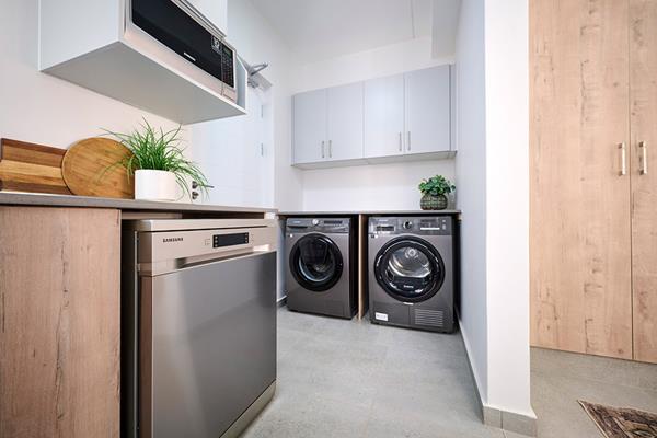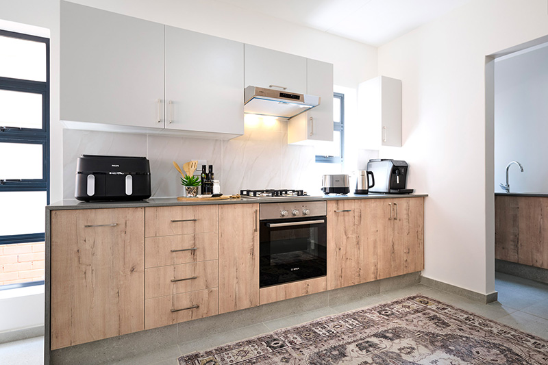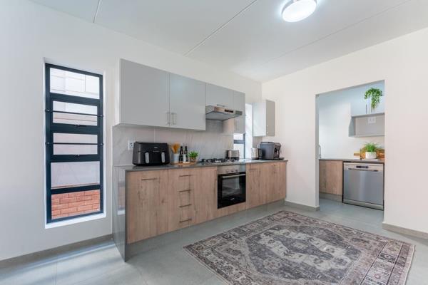 Modern kitchens with scullery. A stylish and functional kitchen equipped with a scullery, ample storage, and space for 3 under-counter appliances. The gas hob and electric oven is ideal for culinary enthusiasts, ensuring a seamless cooking experience. Even during loadshedding.