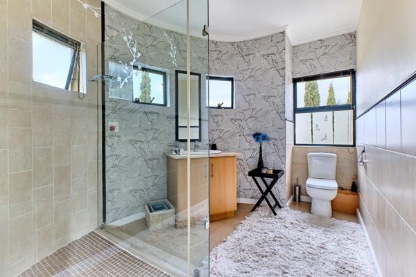 The ground floor open area consists of a barlounge area, huge dining room, guest toilet, closed in patio with a built-in gas braai, which leads out onto a swimming pool with cover, pizza oven and garden gazebo for sunny summer days. A lounge with a wonderful wood burning fireplace and the open-plan kitchen with large centre island, gas stove, space for twin fridge freezer, scullery allowing for three undercounter appliances and pantry leads into a courtyard as well as the double garage.