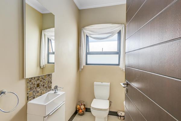 Spacious bedrooms with built-in cupboards, Bathrooms main en-suite with bath, shower, and double vanity, Family bathroom with bath tub, sink, and loo. Open-plan living and dining areas, fully tiled living spaces with carpeted bedrooms. The guest loo is perfectly positioned. Double automated garage with direct home access, Pet-friendly complex.