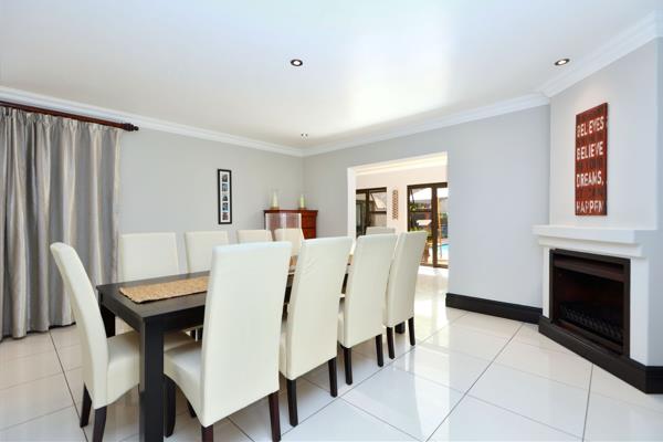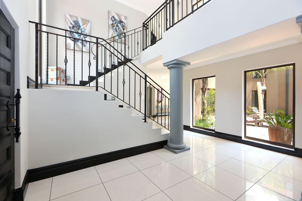 Upon entering, one is greeted by a bright and spacious entrance hall, distinguished by high ceilings and gleaming white tiled floors that extend throughout the primary living areas. An elegant wrought iron staircase railing ascends to the upper levels, enhancing the sense of grandeur. The residence comprises five substantially proportioned bedrooms, four of which are ensuite. Three enjoy having their own balconies with beautiful views. The home is thoughtfully designed with two distinct lounges and two dining rooms, providing versatile spaces for both formal entertaining and relaxed family gatherings. The living areas benefit from abundant natural light streaming through large windows, which provide serene views over the private garden and neighbouring green spaces. Modern amenities such as 3 built-in fireplaces creates inviting focal points, while recessed lighting and elegant crown moulding add to the sophisticated ambiance. The home also includes a dedicated home office, and well-appointed pantry and scullery, as well as 3 garages.