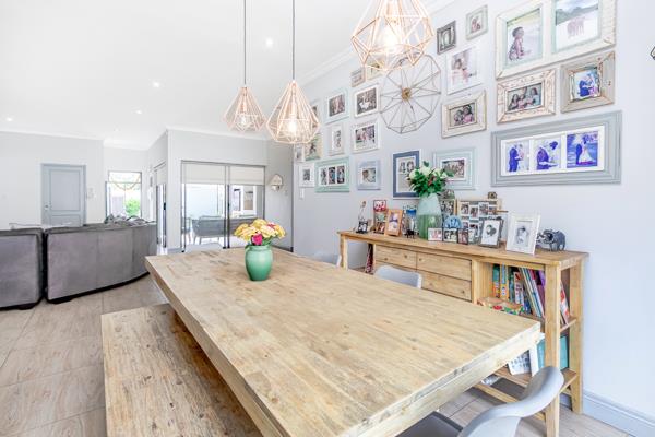 The lounge extends effortlessly to a covered patio with a built-in braai, creating an ideal indooroutdoor space for year-round entertaining. A sparkling pool completes this easy-living family setting.