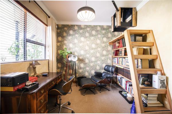 A charming bedroom with a large built-in cupboard also features a hidden loft area, perfect for children to relax and play. Down the passage from the entertainment area is a stylish guest loo. The home also offers a beautifully designed pajama lounge with parquet flooring, positioned to foster family togetherness while cooking or entertaining.