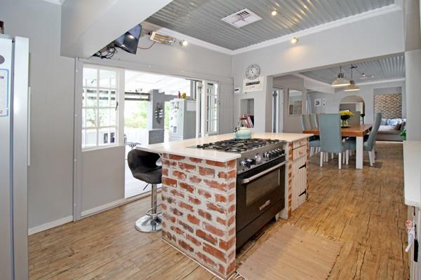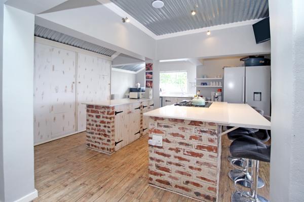 The TV room, dining area, and kitchen all feature doors that open onto a spacious, covered patio, thoughtfully divided into zones. The first zone is a dedicated play area for children, while the dining area and outdoor kitchencomplete with a gas braai, pizza oven, outside sink and food preparation areaoffer the perfect space for entertaining.