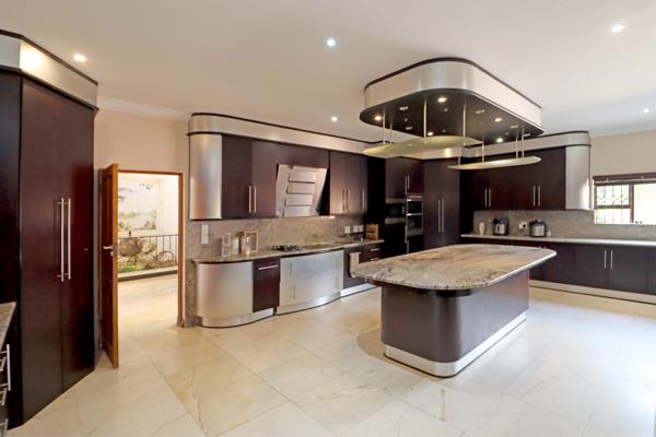 The expansive kitchen is fitted with granite countertops, a central island, and solid wood finishes throughout. It includes a spacious scullery and can also be accessed conveniently from the second double garage.