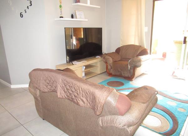 There are three spacious bedrooms with built in cupboards. The main bedroom can easily fit a king-sized bed. There are two bathrooms one of which is an ensuite with a shower, basin and toilet. The second bathroom that services the other two bedrooms has a bath/shower combo, basin and toilet. This property also comes with double covered garages and ample visitors parking. Electricity is pre-paid.