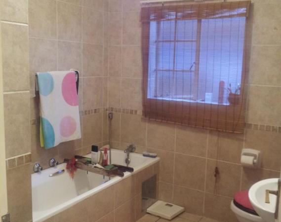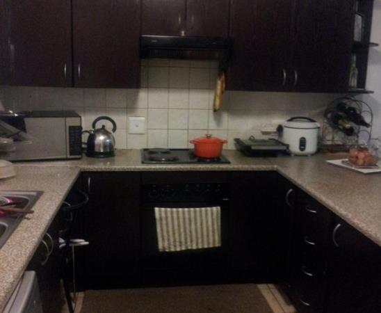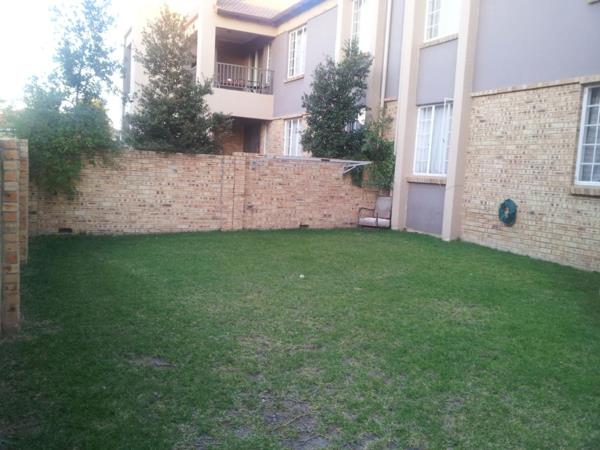The kitchen has a lot of cabinetry, double sink, electric stove and oven with extractor hood, space for a large fridge and 2 appliances. It offers a 4 seater breakfast nook. The open plan kitchen leads to a large open plan lounge which leads to a large patio with built in braai. There is a large private garden beyond the patio.The 2 good sized bedrooms with built-in cupboards share a family bathroom with a bathtub, toilet and basin.The master bedroom has a lot of cupboards, a dresser with en-suit bathroom that has a shower, toilet and basin. The unit has a double lock up garage.