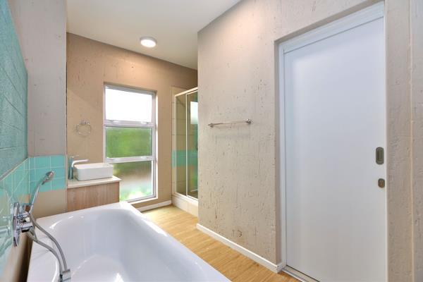The bedroom is a serene retreat, complete with built-in cupboards for maximum storage and a sleek built-in vanity or desk ideal for working from home or getting ready in style. The bathroom impresses with a modern bath and a separate shower, offering the best of both worlds.