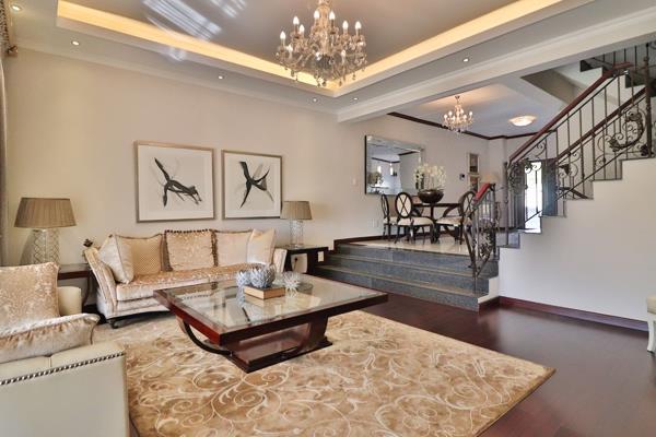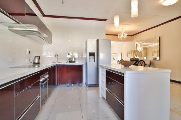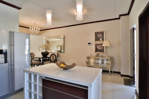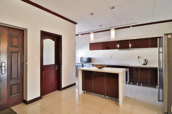 -This level hosts a modern kitchen with breakfast nook area. The kitchen has contrasting colours with Caesar Stone counter tops. The kitchen leads in the dining area. This level has a guest toilet. The dining area leads to a sunken lounge which has bulkheads for hidden detailed lighting. The lounge leads out on a covered Patio with Built-in Braai. This large patio over looks a green belt and leads to the garden.
