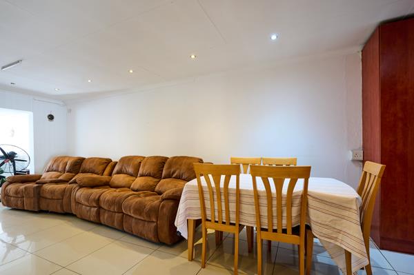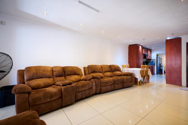 - Spacious living room that allows for large entertainment setup with lounge suite. Lounge leads to an enclosed dining room that is currently being used as office space but will be ideal for a large dining table and arrangements. This room also leads out onto your garden.