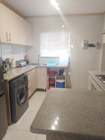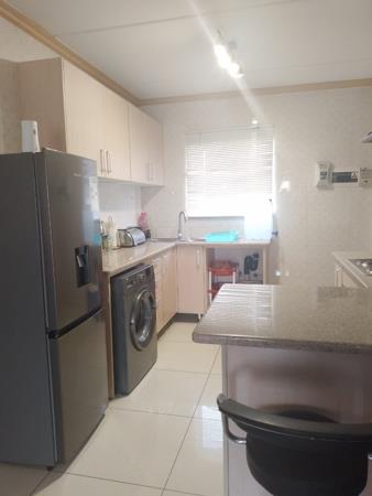 The spacious lounge offers ample room. The bathroom is equipped with a sink, tub, and shower. The complex boasts a lovely garden, braai area, and swimming pool, with 24-hour security for added protection.