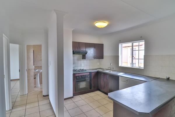 The apartment features a well-designed open-plan layout, combining the lounge, dining area, and a contemporary kitchen equipped with space for a single-door fridge, one under-counter appliance, and a built-in oven and gas stove perfect for functional and stylish living. Both bedrooms are generously sized with built-in cupboards, while the full bathroom offers a separate bath and shower catering to both comfort and practicality.