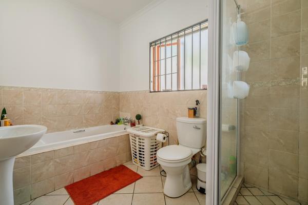 This charming townhouse features an open-plan kitchen with a breakfast nook, space for two under-counter appliances, an electric stove and oven, and a double sink. The kitchen flows into a bright, sunlit open-plan dinning area which leads to the bank entrance, lounge that leads out to a spacious private garden