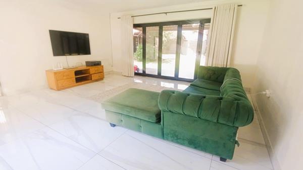 Enjoy seamless indoor-outdoor living as the living area opens up to a spacious garden through elegant sliding doors, perfect for gatherings or quiet afternoons.