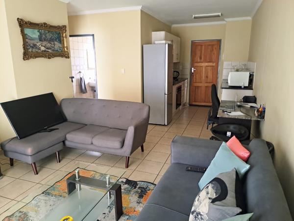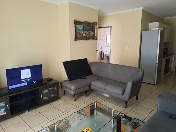 This lovely 2-bedroom, 1-bathroom apartment is situated on the ground floor, offering easy access and comfort. The open-plan kitchen features light-colored cupboards and ample space for all your appliances. The spacious lounge area opens up to a green patio, providing a tranquil outdoor space to relax.