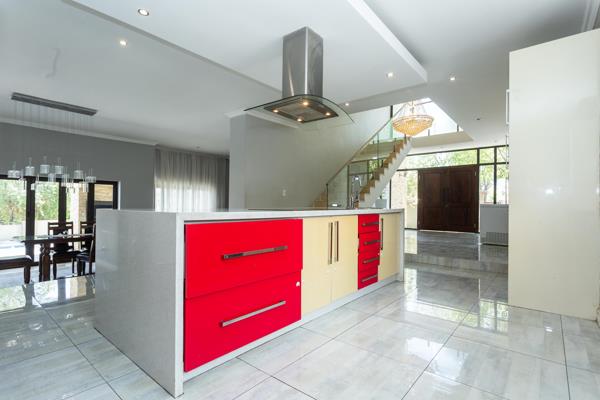 Flowing seamlessly from the kitchen are three spacious living areas: a dining room, lounge, and a well-fitted bar. Both the dining room and bar open out to a covered patio with a built-in braai, creating the ideal indoor-outdoor lifestyle. The bars direct access to the pool makes it perfect for hosting and entertaining guests.