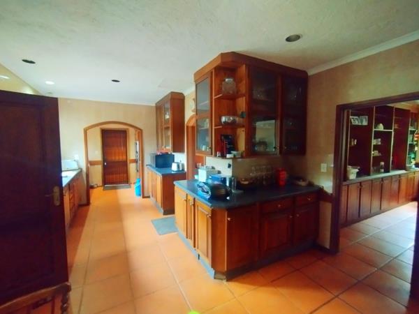 The kitchen is well designed with solid wood cupboards, offering a pantry cupboard, eye-level ovens, built-in hob and separate scullery laundry area. The courtyard from the back door is enclosed with access to a pathway, leading to the stables. The dining room is situated next to the kitchen.