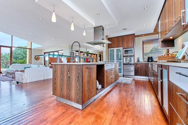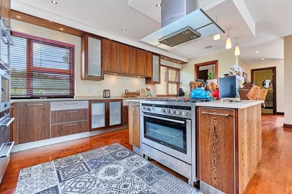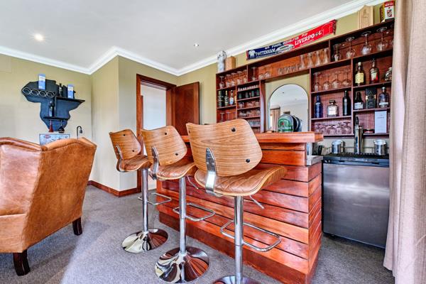 Beautiful solid wooden floors, a sunken lounge overlooked by the lovely kitchen with top end appliances, a built in coffee machine, generous centre island featuring a gas stove contributes to the comfortable homely ambience. The second chefs kitchen has an integrated fridge freezer and doubles up as a large scullery, laundry and pantry with access from the triple garage. The double volume dining room warmed by an electronic pellet heater, leads to a TV lounge and a spacious bar cum sports lounge opening out to the extended patio, which features a pizza oven.