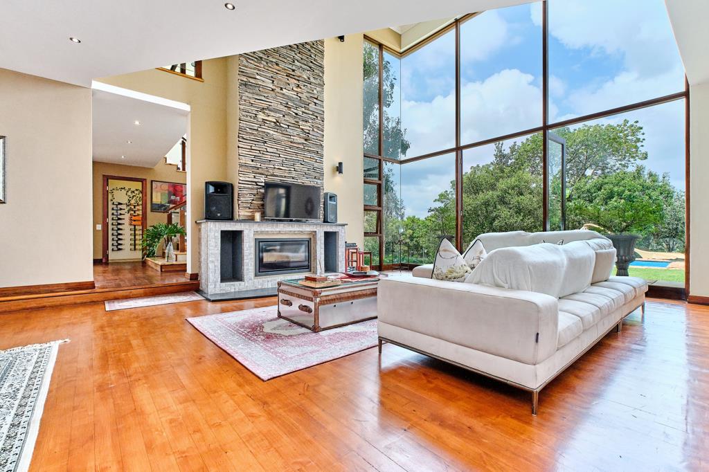 Being situated at the top of a quiet cul-de-sac offers privacy and no drive-by traffic. A double volume entrance welcomes you, which flows easily through to the open plan living area. Double volume floor to ceiling glass windows and doors emphasize the feeling of freedom and space and allow for an abundance of natural light. Stacking doors to an enormous undercover patio overlooking a view to die for towards the South West, as well as the spectacular neat and landscaped garden, decently sized swimming pool, feature dam and tennis court.