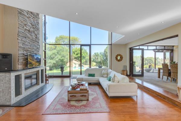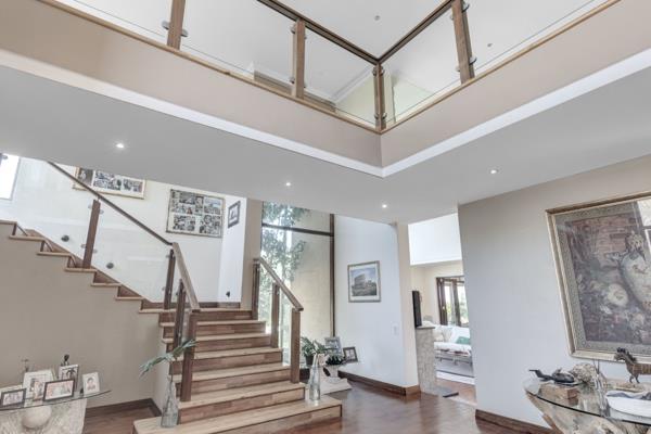 Tucked away on a quiet cul-de-sac, this exquisite residence welcomes you with a grand double-volume entrance, setting the tone for its sophisticated design. Seamless open-plan living unfolds across individually curated lounges and reception areas, enhanced by solid wooden floors and floor-to-ceiling windows that flood the space with natural light. Stacking doors blur indoor and outdoor living, opening to a spacious covered patio and a breathtaking landscaped garden with a shimmering feature dam.