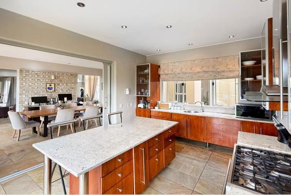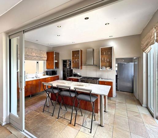 Chefs Kitchen: Featuring a central workspace island, Smeg gas stove, separate scullery, and walk-in pantry. A glass sliding door opens directly onto the deck and a heated swimming pool, blending culinary flair with outdoor living.