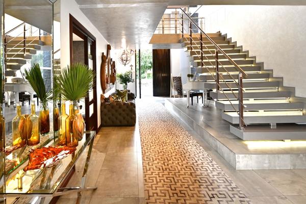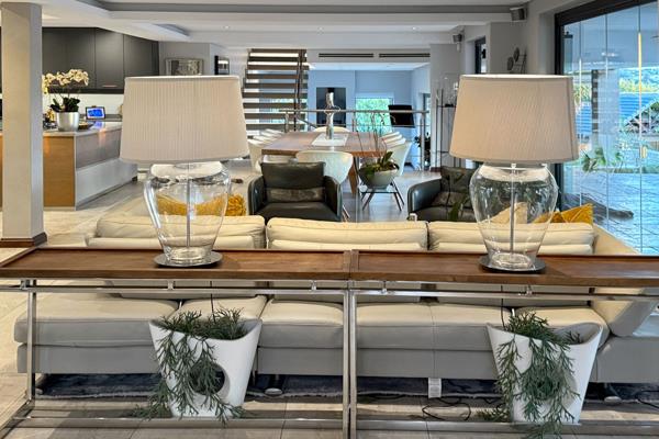 Designed for entertaining the home cascades over multiple terraced levels. The upper level offers uninterrupted sunset views with a 15m rim-flow pool, multiple dining and lounge areas and a built-in bar, all seamlessly blending indoor and outdoor living. A pergola-covered braai station anchors the space complemented by a firepit and sunken heated saltwater Jacuzzi with Malibu-style sit-in bar built for hosting on a grand scale.