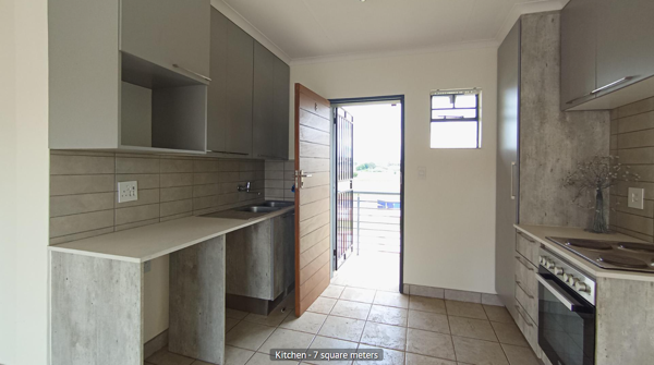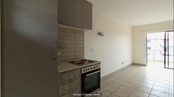 Step inside to an inviting open-plan living space, spanning a comfortable 57 square meters. The lounge area, measuring 17 square meters, flows seamlessly into a compact yet highly functional 7-square-meter kitchen. This modern kitchen boasts sleek grey cabinetry, a practical tiled backsplash, and essential built-in appliances including an oven and electric hob. Tiled flooring extends throughout, ensuring easy maintenance, while large sliding glass doors flood the space with natural light and provide direct access to a private balcony.