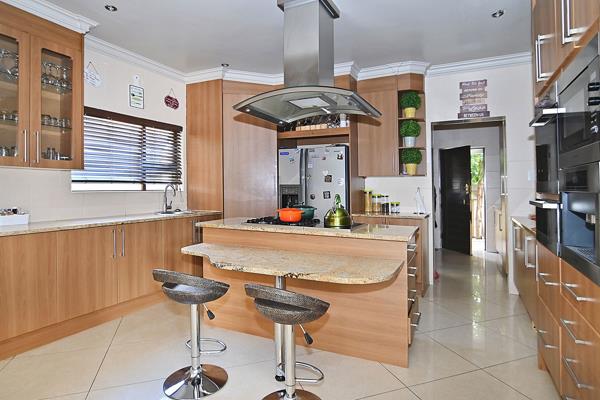 The open dining area flows seamlessly into the modern kitchen, complete with ample cupboard space, a gas stove, and a separate scullery designed to accommodate two under-counter appliances. Folding doors open from the dining room onto a spacious covered patio, perfect for entertaining, overlooking the sparkling pool and landscaped garden. A generous living room, enhanced by a classic wood-burning fireplace, adds warmth and charm.