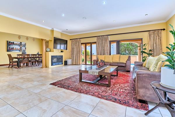 The aluminum stacking doors open onto a covered patio with a built-in braai and a sparkling swimming pool, creating a seamless indoor-outdoor living experience.