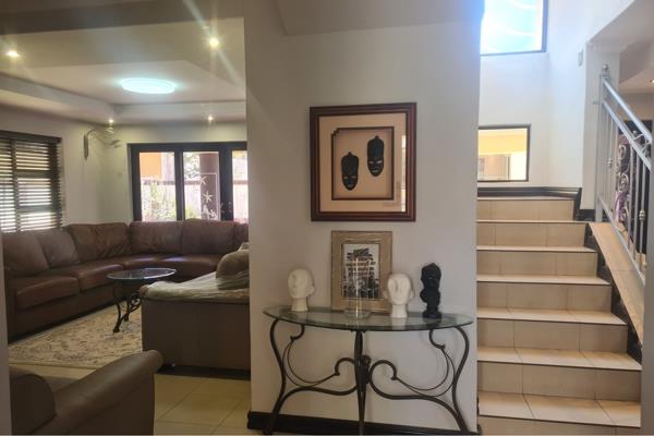 This exceptional double-storey family home, located in a highly sought-after secure estate, is designed for comfort, luxury, and convenience. Upon entering the home, youll be greeted by a private lounge and dining area, creating an inviting space for family gatherings and relaxation. A guest bathroom adds a touch of practicality, and an en-suite bedroom on the ground floor offers privacy and comfort.