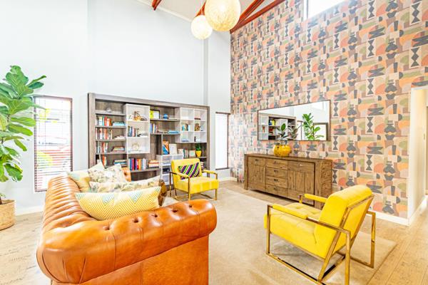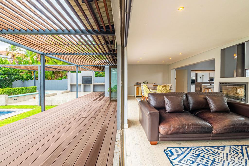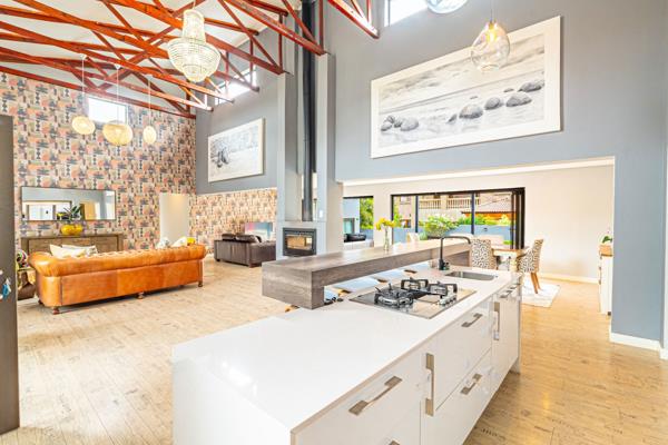 The grand living areas feature a double-volume ceiling with exposed wooden trusses, creating a warm and welcoming atmosphere. Elegant lighting, including a stunning chandelier, complements the space, while a central feature fireplace adds a touch of charm. Fold-away sliding aluminium doors seamlessly connect the indoors to the expansive wrap-around deck, leading you to a beautifully landscaped, yet low maintenance garden, sparkling pool, inviting boma area, and a spacious patio with a built-in braaiideal for outdoor dining and relaxation.