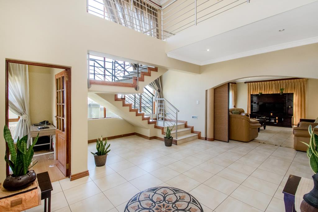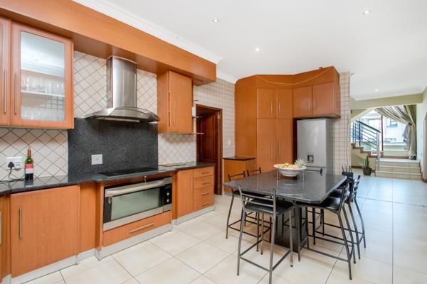 A second lounge offers flexible use and can easily be converted into an additional bedroom. At the heart of the home lies a chefs dream kitchen, featuring top-quality granite tops, a breakfast nook, ample cupboard space, and a scullery that connects directly to the double garage and leads out to a private courtyard. Here, you will find a one bedroom staff quarters with its own bathroom and reception space for added convenience. The ground floor is completed with a comfortable guest bedroom and en-suite bathroom, providing privacy and comfort for visitors.