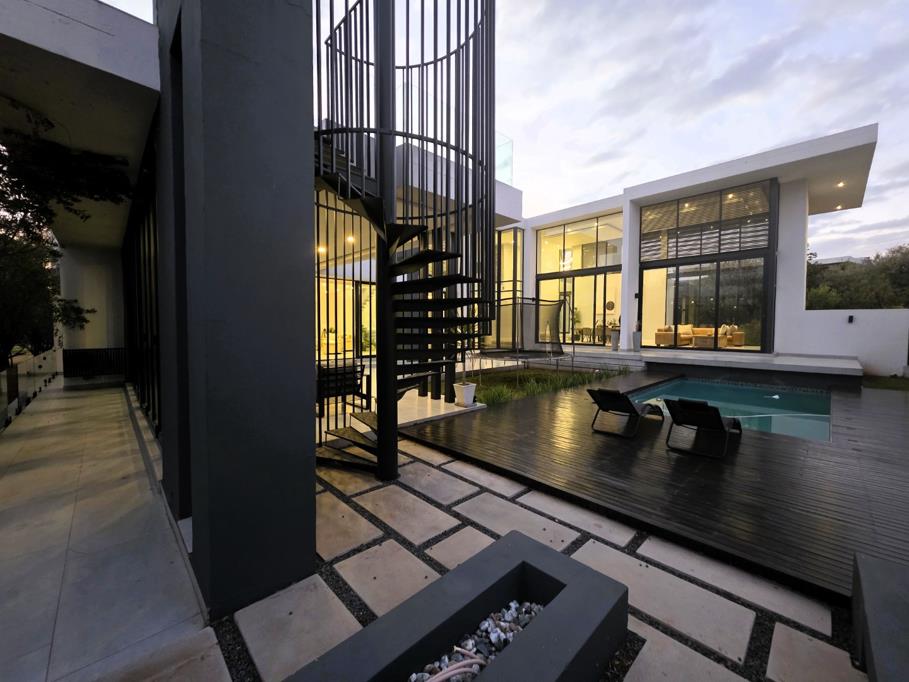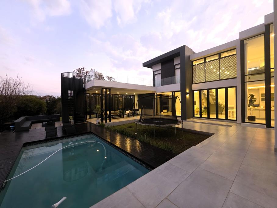 This ultra-modern residence offers the ultimate in luxury living, located in the prestigious and secure Steyn City. Tucked away in a quiet panhandle and surrounded by lush greenery, the home provides both privacy and tranquility.