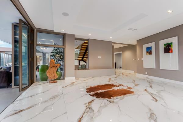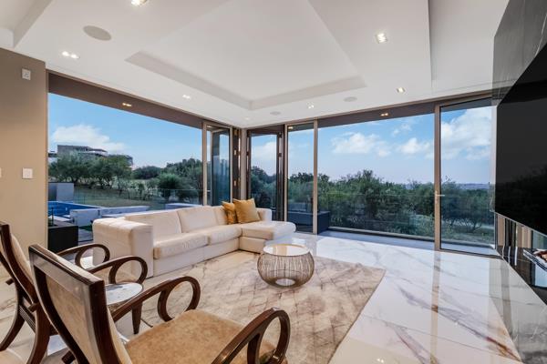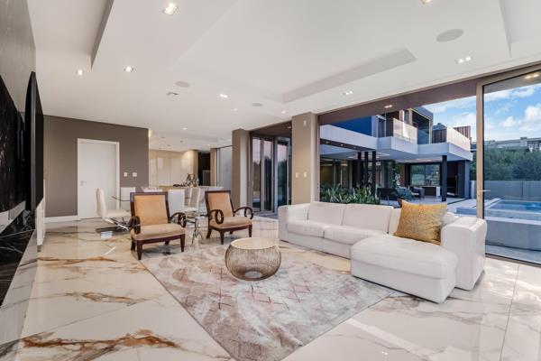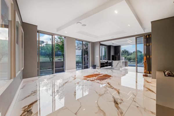 From the moment you arrive, striking water features and LED-lit accents set the tone for the elegance within. A grand entrance leads to expansive living spaces, where high ceilings, north-facing orientation, and seamless integration of indoor and outdoor living define this residence. Aluminum stacking doors with double-glazed glass invite natural light while creating effortless flow to multiple outdoor entertainment areas, including a sparkling infinity pool, gas firepit lounge, and an alfresco kitchen with built-in braai.