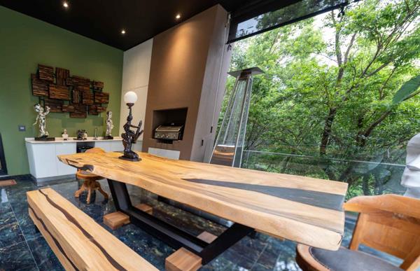 Expansive floor-to-ceiling picture windows flood the interiors with natural light while framing uninterrupted panoramic views of the lush landscape beyond. Every space has been carefully curated to invite the outdoors in, enhancing the homes sense of openness and tranquility.