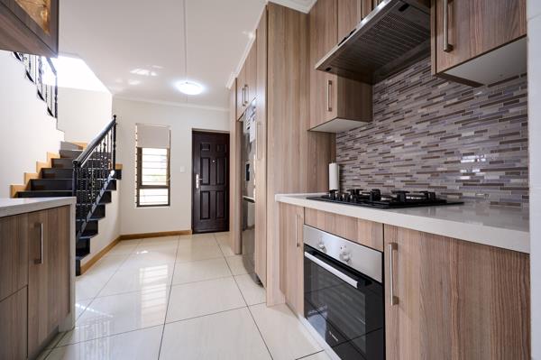 - A stunning modern kitchen finished with veneer cupboards and granite counter-tops, a four-plate gas stove and oven. A separate scullery with provisions for two under-counter appliances.