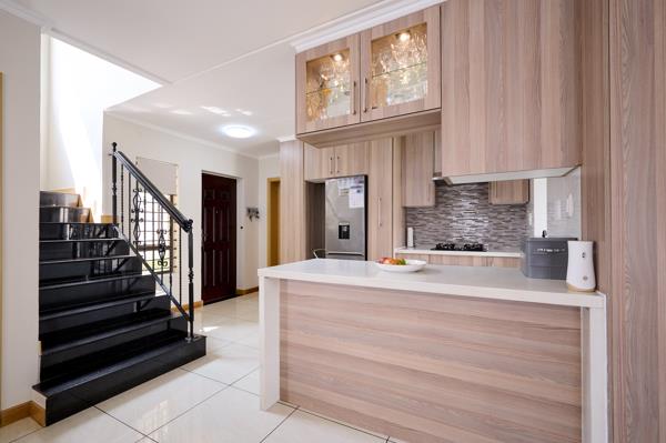 - 4 lovely bedrooms. Each bedroom is fitted with laminate flooring and ample built-in cupboards. All bedrooms are located upstairs. Two of the bedrooms have en-suite bathrooms.