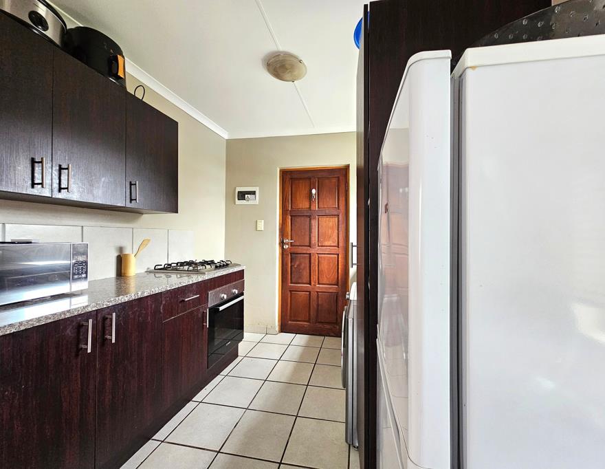 Open-Plan Kitchen & Lounge Modern layout with granite countertops, space for a fridge, gas hob stove, and an additional appliance. Plenty of cupboard storage.